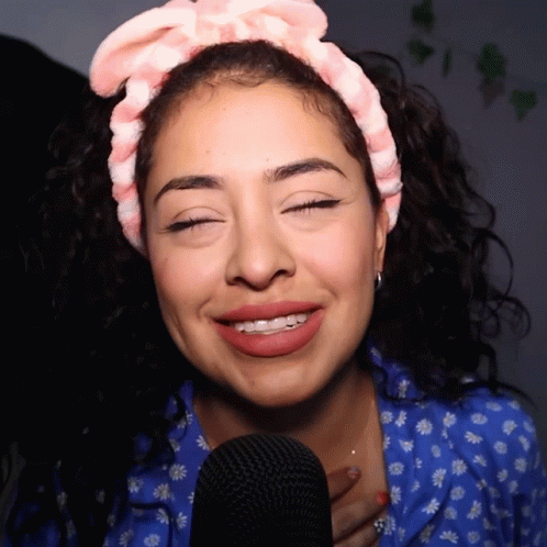 Merith Aranda laughing and smiling into a microphone, wearing a pink headband and blue daisy shirt.