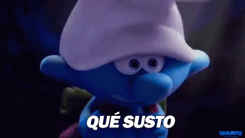A Smurf character reacts with surprise, exclaiming 'Qué Susto' (What a scare) in a funny moment.