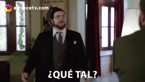 Gaston Cocchiarale in a suit greets another man with a handshake, saying 'Qué tal?' (What's up?).
