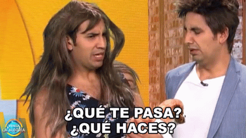 El Capi in a wig asks '¿Qué te pasa? ¿Qué haces?' to another man on Venga La Alegría.
