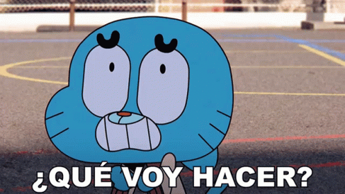 Gumball Watterson from The Amazing World of Gumball panics, asking '¿Qué voy a hacer?' (What am I going to do?).