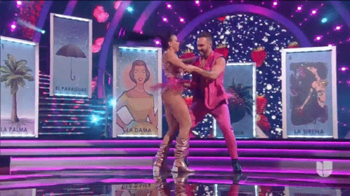 Maria Jose Alvarado and partner perform a dynamic Quebradita dance on a vibrant stage adorned with Loteria cards.