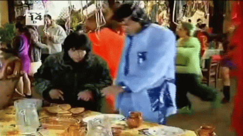Ludovico Peluche, played by Eugenio Derbez, eats food greedily at a table, leaving nothing for others.
