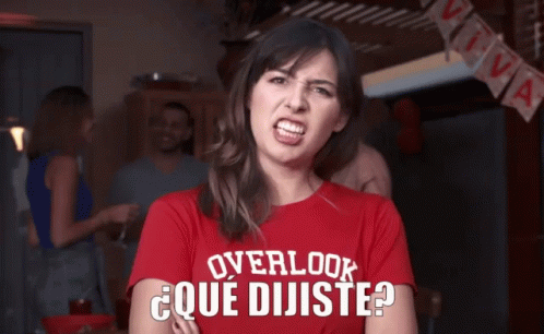 A woman in a red 'OVERLOOK QUÉ DIJISTE?' t-shirt reacts with anger then confusion, asking 'What did you say?'