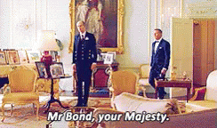 James Bond, played by Daniel Craig, is introduced to Queen Elizabeth II in a formal setting, with the caption 'Mr Bond, your Majesty'.