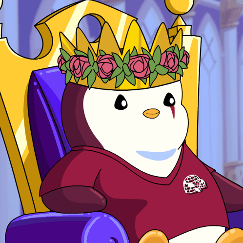 Pudgy Penguin character, adorned with a rose crown and maroon shirt, sits regally on a golden throne.