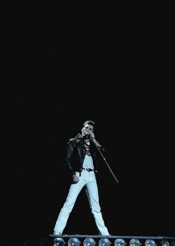 Freddie Mercury of Queen delivers an iconic live performance on stage, striking a powerful pose with his microphone.