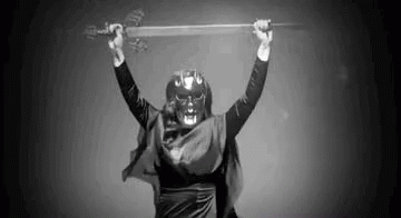 Queen Yas, wearing a mask and cape, dramatically raises and lowers a glowing sword in a black and white scene.