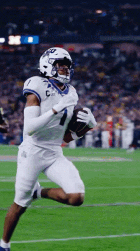 Quentin Johnston, wearing number 1, runs into the end zone for a touchdown for TCU.