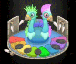 The Rare Quibble monster from My Singing Monsters, a two-headed bird-like creature, on its colorful platform.