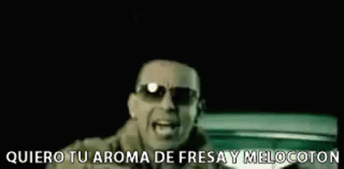 Daddy Yankee in sunglasses, passionately singing 'Quiero Tu Aroma De Fresa Y Melocoton' about a sweet scent.