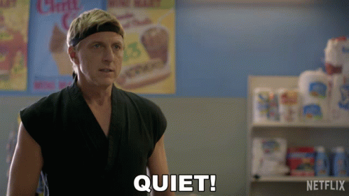 Johnny Lawrence from Cobra Kai, played by William Zabka, shouts 'QUIET!' in a store setting.