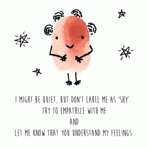An illustration of a fingerprint character with text about not labeling quiet people as shy, emphasizing empathy.