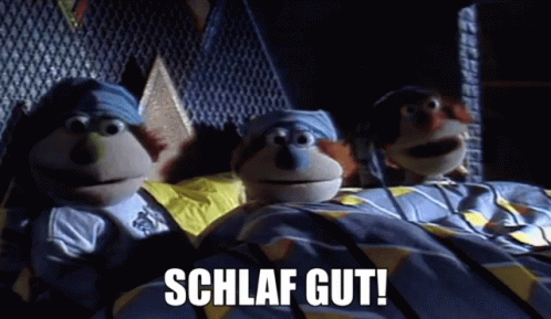 The Quietschboys from "Hallo Spencer" are tucked into bed, wishing everyone "Schlaf Gut!" (Sleep Well!).