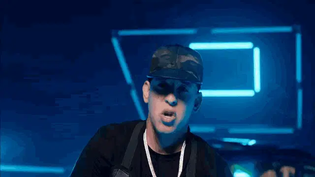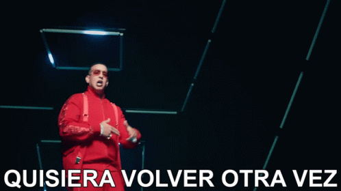Daddy Yankee performs 'Quisiera Volver Otra Vez' in a red jacket and sunglasses, gesturing on a dark stage.