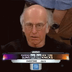 Larry David reacts with a wide-mouthed shout during an intense Phoenix Suns vs. New York Knicks overtime game.