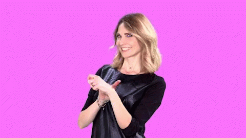Teresa D Alessandro, QVC Italia presenter, gestures to hurry up on a pink background.