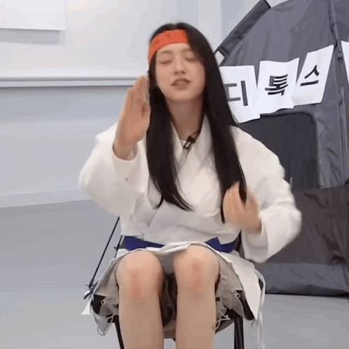R U Next's Chanelle Moon practices karate punches, wearing a gi and red headband with a bright smile.