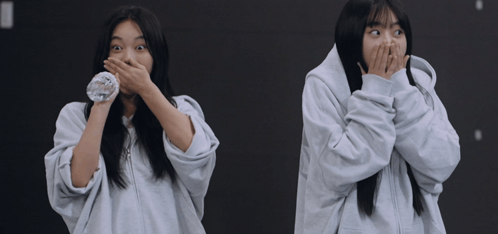Hyewon and Jihyun from R U Next show a shocked and surprised reaction, covering their mouths.