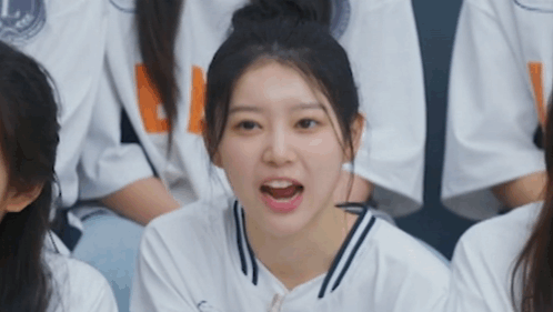 a girl in a white shirt with the letter l on the front