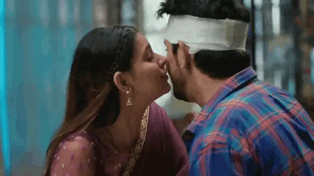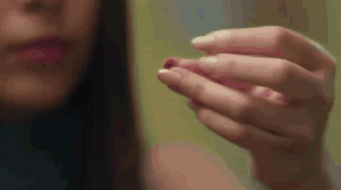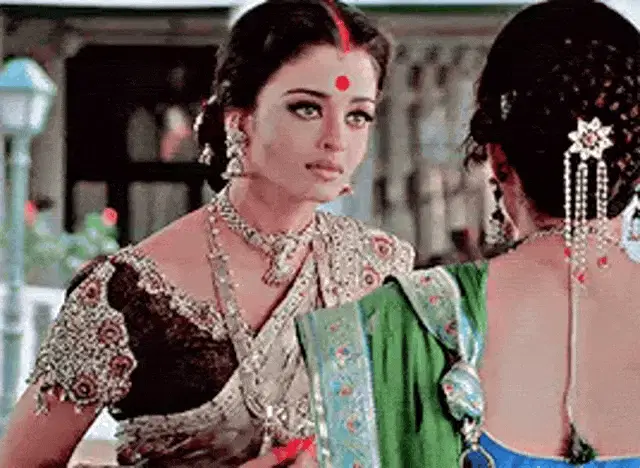 Raavi Pandya Shivi applies sindoor in her hair parting, a traditional Indian ritual, while looking into a mirror.