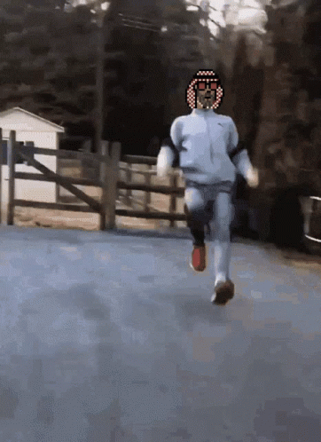 A person with a pixelated head, identified as Rabpunkz, runs quickly towards a basketball hoop on a driveway.