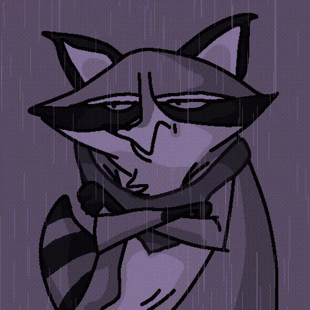An animated raccoon with a scarf stands in the rain, looking pensive and a bit grumpy.