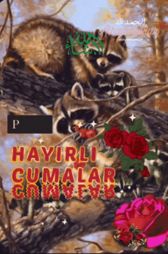 Pelin shares a beautiful painting of raccoons on a tree branch with roses, wishing blessed Fridays.