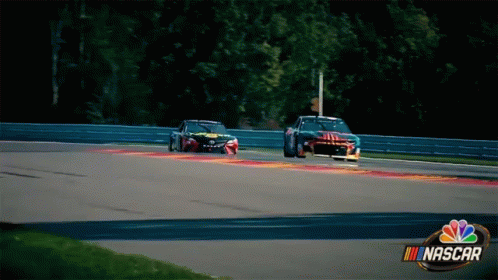 Two NASCAR racing cars, a Toyota Camry and a Chevrolet Camaro, speeding on a track.