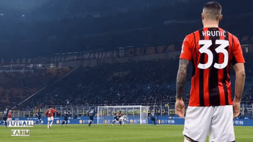 Rade Krunic of AC Milan celebrates on the field after a goal, wearing his number 33 jersey.