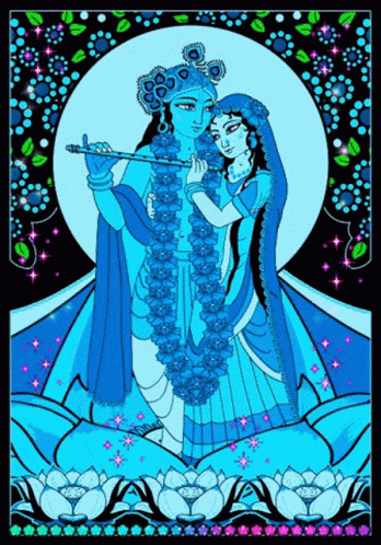 Beautiful animated devotional art depicting Radha and Krishna with sparkling glitter effects and lotus flowers.
