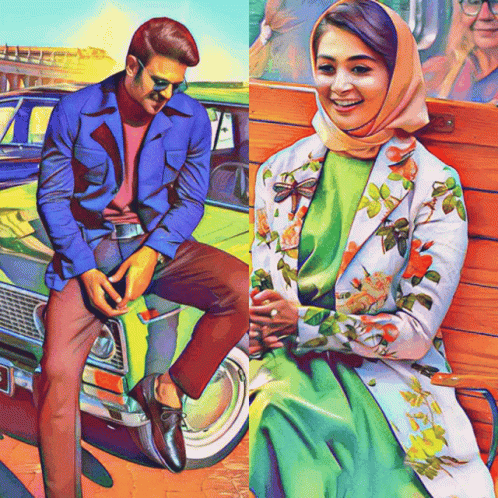 Pooja Hegde and Radhey Shyam in an artistic portrait, featuring a man on a vintage car and a woman in a floral coat.