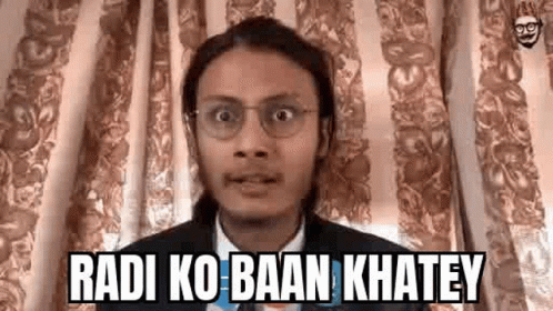 Man in glasses making a funny, exaggerated face with the meme caption 'Radi Ko Baan Khatey'.