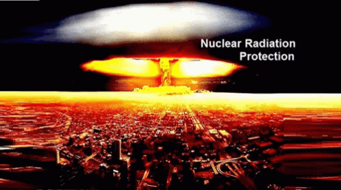 A powerful nuclear explosion mushroom cloud looms over a city, with text emphasizing nuclear radiation protection.