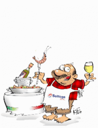 Cartoon character Radicci from Bottega Del Mare celebrates with shrimp, wine, and hope.