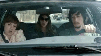 A man driving a car looks annoyed while two women in the back seats sing loudly to radio music, creating a classic road trip scenario.