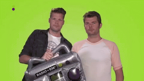 Coen and Sander hold an inflatable Radio 538 boombox against a green screen.
