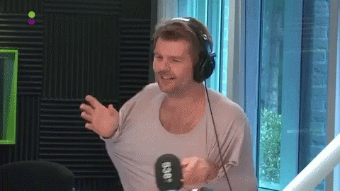 Sander from Radio 538, wearing headphones, makes funny arm movements and dances in the studio.