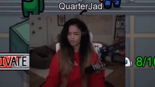 Valkyrae, wearing headphones and a red shirt, reacts during a live stream, with a microphone in front of her.