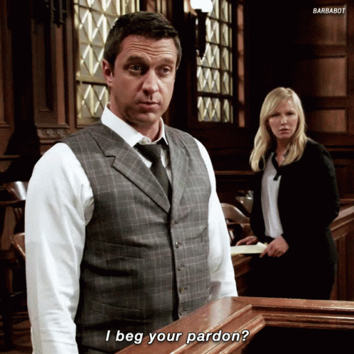 Rafael Barba (Raul Esparza) in a courtroom setting asks, 'I beg your pardon?'