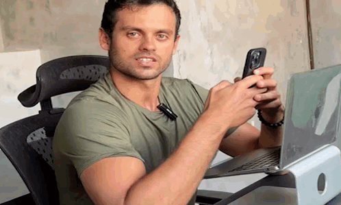 a man is sitting at a desk holding a cell phone in front of a laptop .
