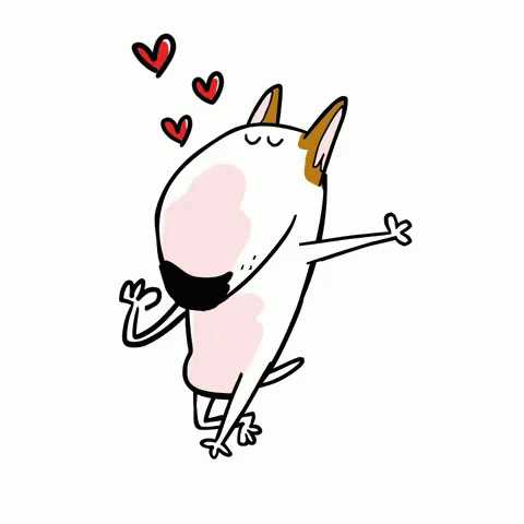 Rafael Mantesso's cartoon Bull Terrier, Jimmy The Bull, stands with a heart, showcasing his charming personality for Jimmychoo.