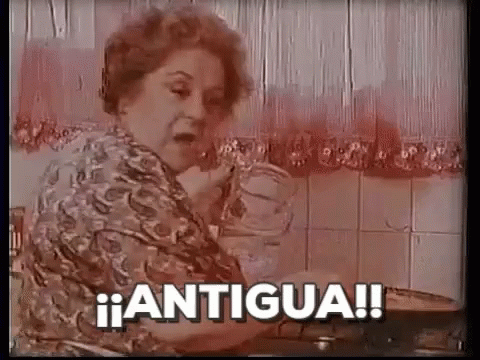 Rafaela Aparicio in a kitchen, reacting with '¡¡ANTIGUA!!' while washing dishes.