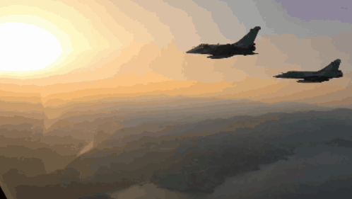 Rafale F3R and Mirage 2000-5 fighter jets of the Hellenic Air Force flying in formation at sunset.