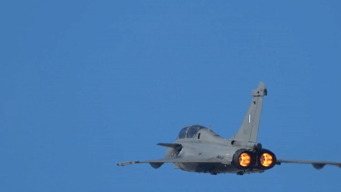 Rafale jet with full afterburner engaged, taking off for the Hellenic Air Force.