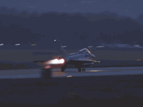 Dassault Rafale fighter jet takes off with full afterburners during a sunset, part of the Hellenic Air Force.