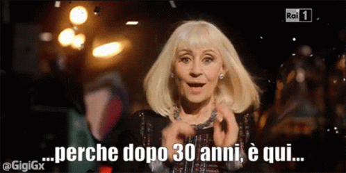 Raffaella Carrà reacts with surprise as someone returns after 30 years on Italian TV.
