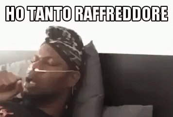 A person with a bad cold and cough, lying in bed with an oxygen mask, captioned 'Ho tanto raffreddore'.
