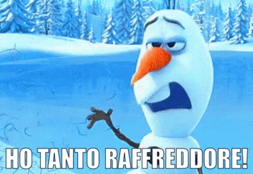 Olaf the snowman from Frozen, suffering from a cold and sneezing, with the Italian caption 'HO TANTO RAFFREDDORE!'.