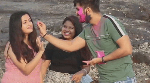 Sahil Virwani applies color to a girl during the vibrant Holi festival, surrounded by friends.